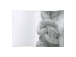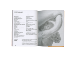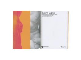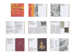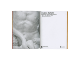 An accompanying publication features detail shots of Laocoön, a figure from Greek and Roman mythology, from various perspectives. The close-ups and individual shots are set against a red background, interspersed with spaciously laid-out titles and a restrained design in black and white.