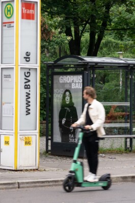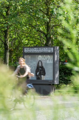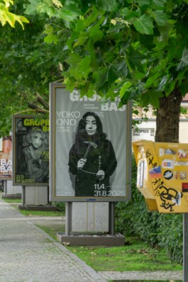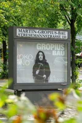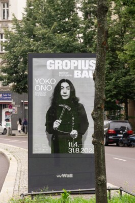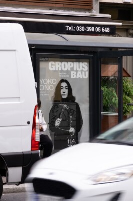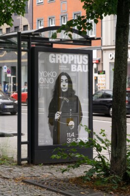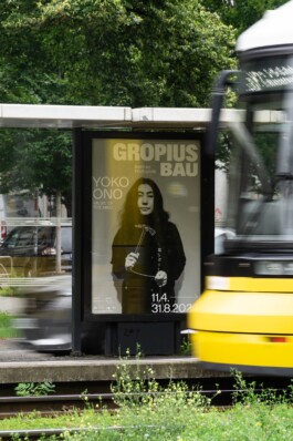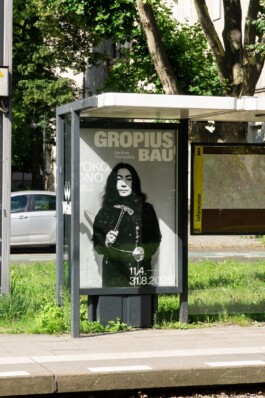 Die umfangreiche Werkschau „Yoko Ono: Music of the Mind”eröffnet neue Perspektiven auf das Schaffen Onos, jener wegweisenden japanisch-amerikanischen Künstlerin, die als zentrale Figur der Fluxus-Bewegung internationale Bekanntheit erlangte. Für die begleitende Kampagne ist Yoko Ono im Berliner Stadtraum präsent: Motiv der Kampagne ist ein Portrait der Künstlerin, die eines ihrer Werke in der Hand hält (Yoko Ono with Glass Hammer, 1967). Die weiße Typografie vor hellgrauem Grund ist kontrastarm und tritt so in den Hintergrund zurück, während Onos Abbildung als Schwarz-Weiß-Fotografie in den Vordergrund drängt. Mit ihrem direkten Blick in die Kamera erwidert Ono den Blick derer, die Ausstellungsplakate und -banner im Stadtraum entdecken.